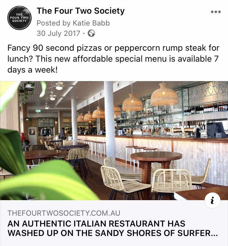 Whilst working for the Four Two Society magazine in Gold Coast, Australia, I was definitely living the dream by being employed to visit and critique new restaurants, bars and Cafes writing up reviews and being able to take my own photographs to support my features. I very quickly became one of the biggest contributors and a trusted go to for the magazine with my number of articles doubling and being given additional duties including writing all online articles, controlling the social media accounts and heading my own Health and Wellbeing section. I also attended all the press and media events networking on behalf of the magazine acting as the face of the company to build a bigger client base.I